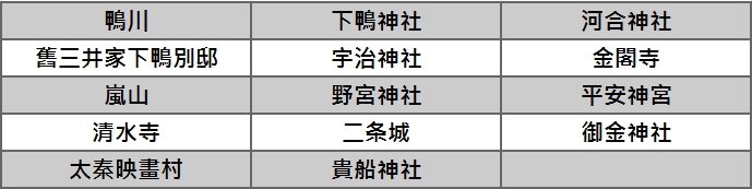 假日有時候會一個人去外面踏青,因為喜歡京都勝過於大阪,常常一個人去京都走走看看,宿舍走路到車站不用五分鐘,而且從惠美須町站到北濱站轉搭京阪電車或是不轉乘直接搭大阪堺筋線及阪急電車的直通電車都非常方便。因此我去了下表這些地方。