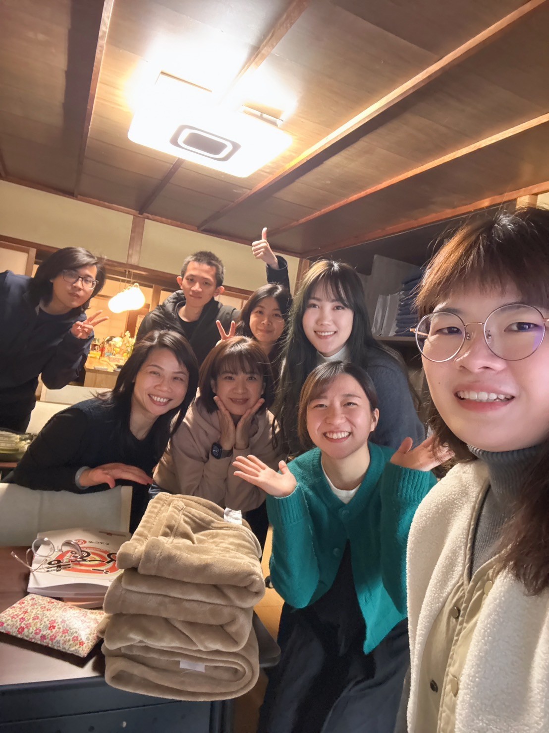 「お帰り~」這是每天回宿舍後最期待聽到的一句話,大家總會熱情的歡迎每個回家的人,這次的遊學生活裡,很幸運地遇到一群溫暖又貼心的同學,我們幾乎天天都一起出去玩、一起吃飯,即使沒有一起行動,感情也不受影響;託大家的福,成功達成了許多不一樣的體驗:看到了白雪覆蓋的貴船神社、一起在宿舍吃春酒還有人生第一次的「二次會」……要是沒有這些同學,這趟遊學或許會變得枯燥無味,但因為有他們,一切都變得別有風趣。