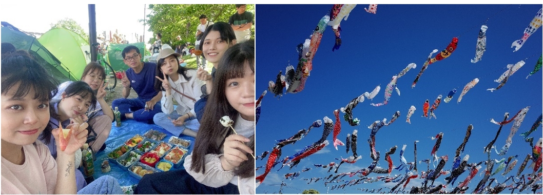 在日本的兒童之日時和同學一起去野餐看鯉魚旗